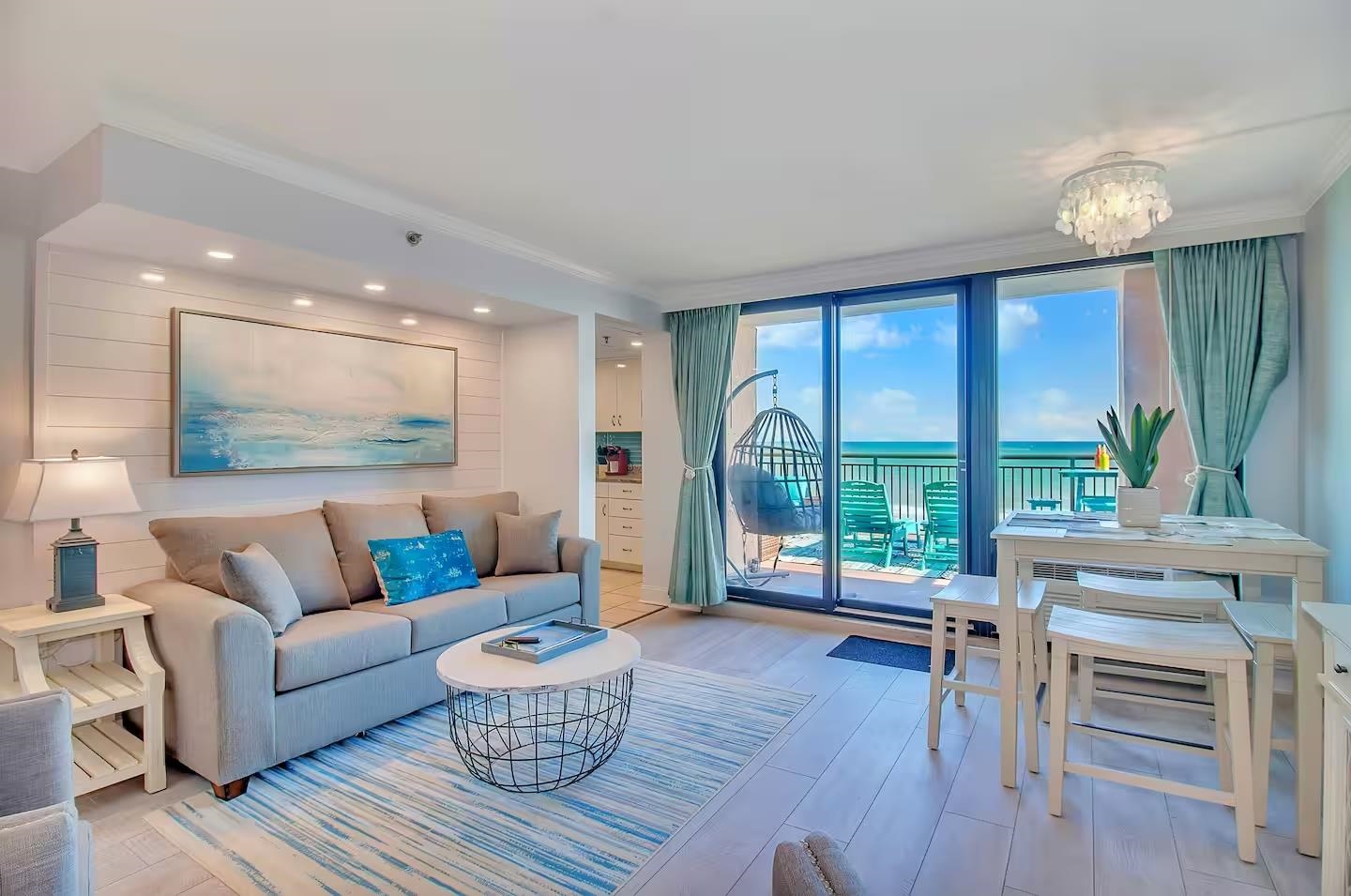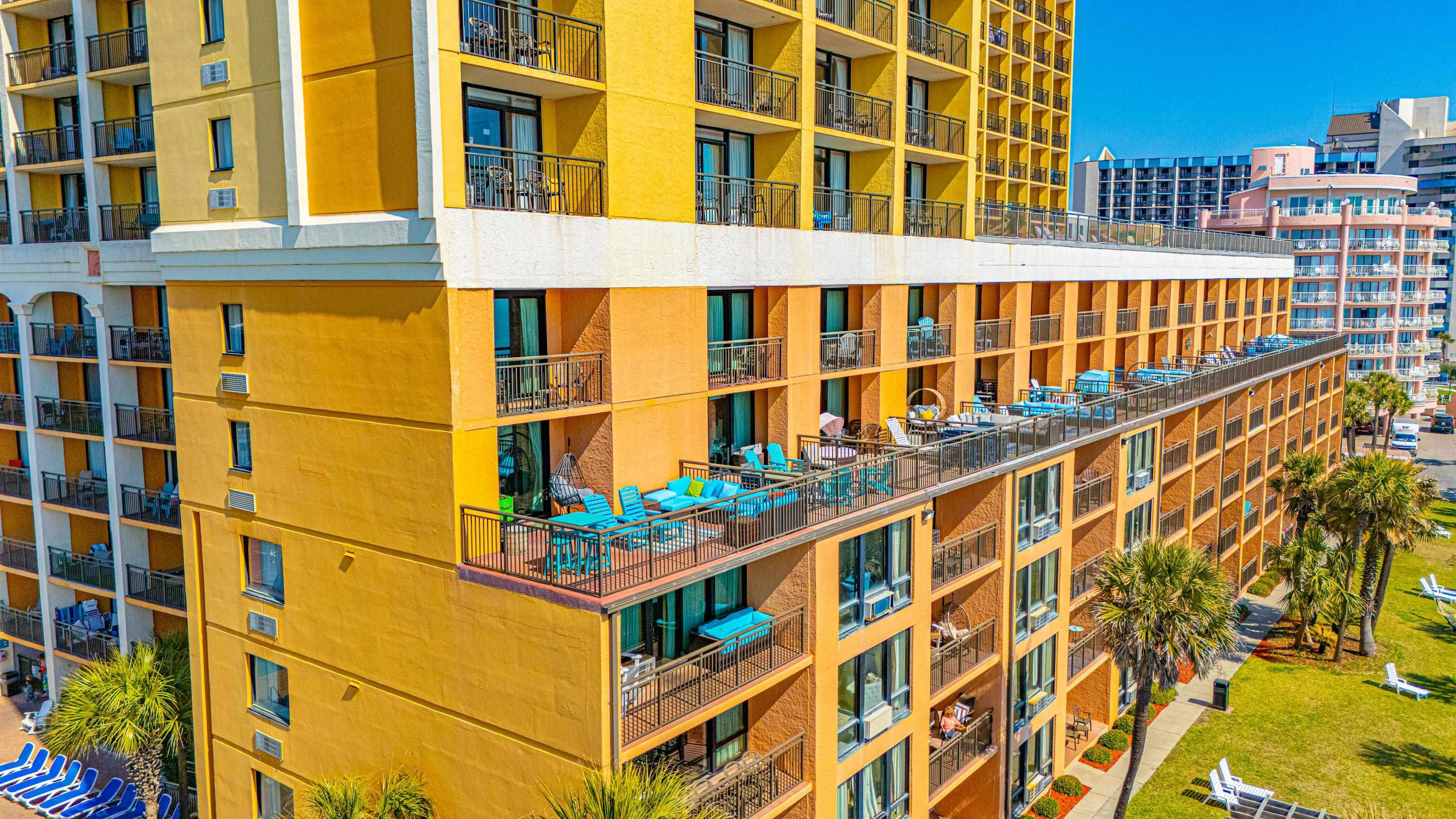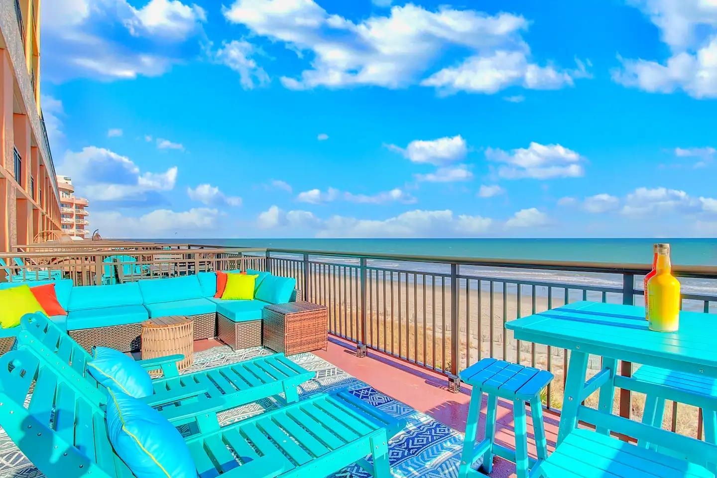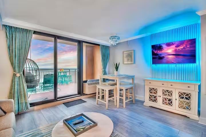 One of the most unique oceanfront properties in town. This corner end unit has one of the largest sun deck balconies on the coast. This is the only true one bedroom on this floor and the balcony is larger than all of the other studios on this famous 5th floor at Caravelle. This spectacular unit was just updated with high end LVP flooring with an oversized true one bedroom with a rock tile fireplace and view all the way down the coast from the bedroom window. The owner added a separate sleeping area with shiplap and a twin bed and tv near the entrance and also added and extra closet. The Living room was extended and larger than all the other one bedrooms with this layout as the murphy bed wall was removed with shiplap and can lighting making it feel like a true large living room. There is a nice full size kitchen with granite, backsplash, and stainless-steel appliances. The super-sized amazing deck with that southern coastal view is like nothing else you have ever seen. It is equipped with a new wrap around section sofa, 2 loungers and a high top 4 seating dining seat. This one of a kind unit will not last long as properties like this rarely comes up for sale. Located on the quieter northern end of Myrtle Beach, amazing location for walking the beach, right beside the Golden Mile where you can walk in front of the less crowded oceanfront homes. Caravelle Resort offers a wide range of amenities including indoor and outdoor pools, a lazy river, a kids' splash area, an onsite restaurant and bar, laundry facilities, and a parking deck conveniently attached to the building. If you've been waiting for a rare corner layout at Caravelle, this is one you don't want to miss.