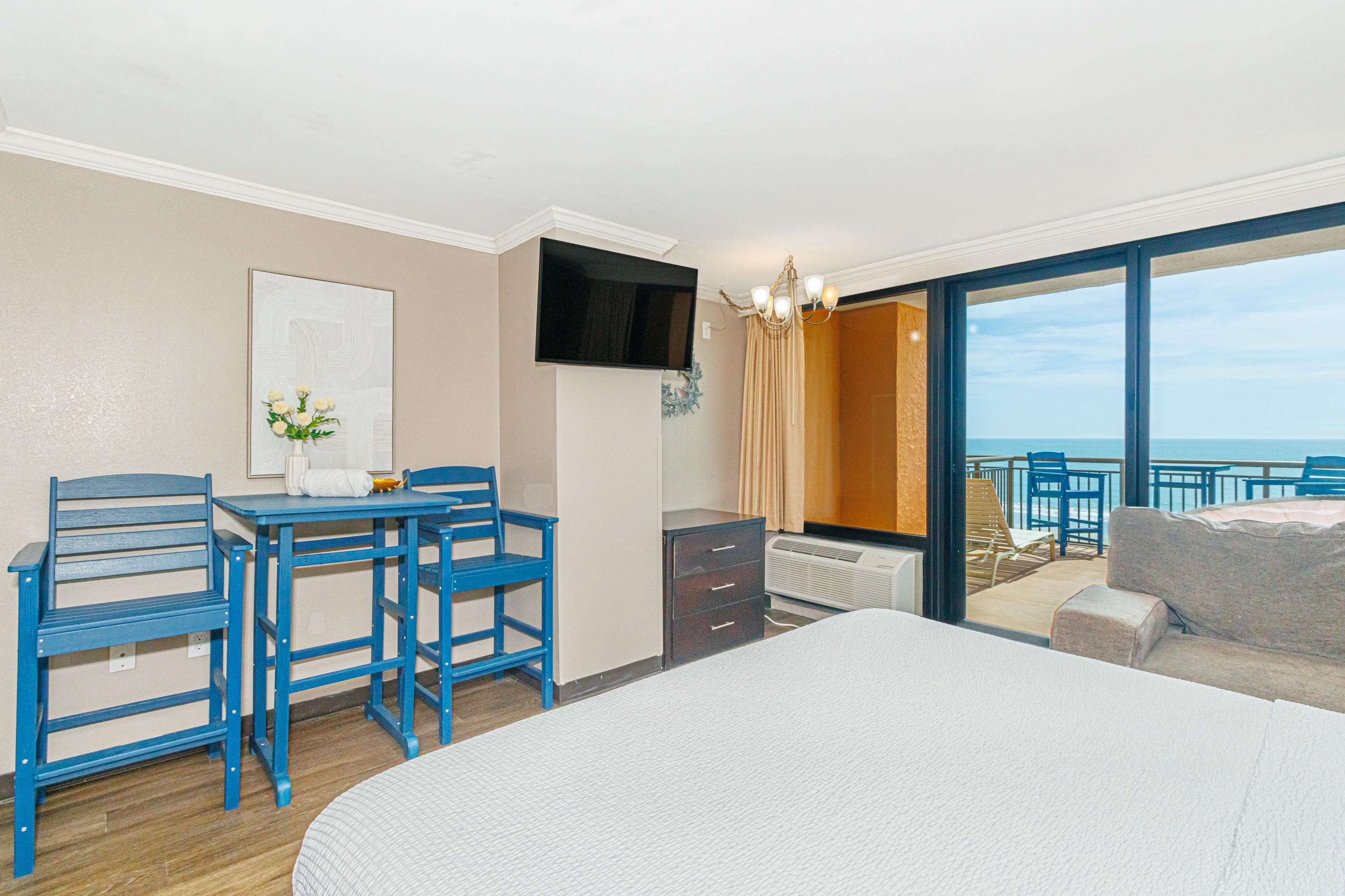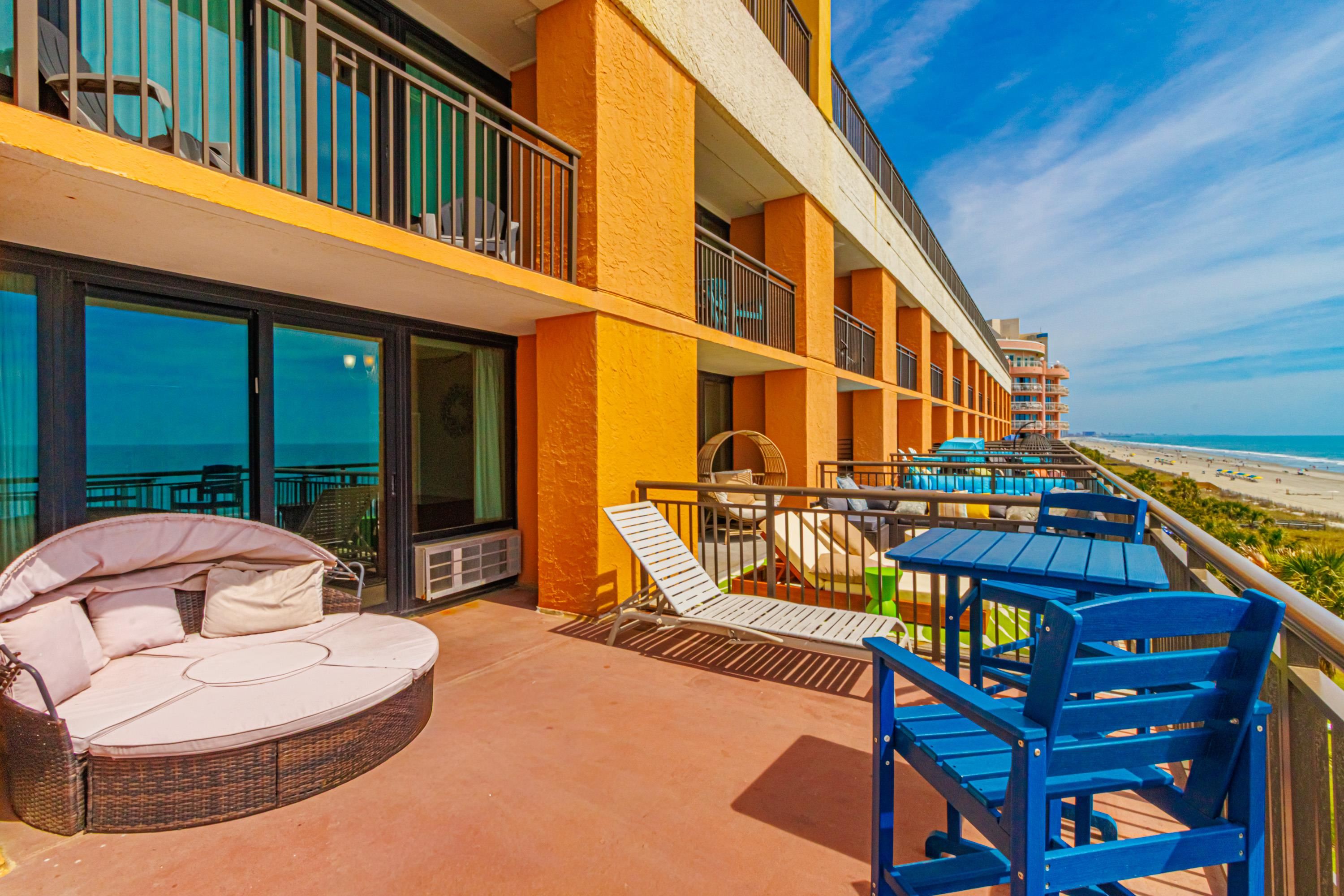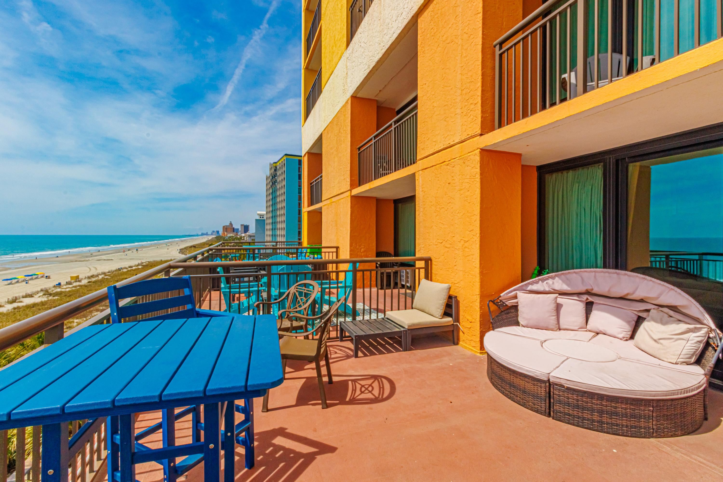 One-of-a-Kind Oceanfront Retreat at The Caravelle Discover one of Myrtle Beach's most coveted condo styles -- the exclusive 5th-floor sundeck units at The Caravelle Resort. These rarely available homes are known for their unbeatable rental performance and unforgettable oceanfront views. Step inside this fully furnished, tastefully updated condo featuring luxury vinyl plank flooring, smooth ceilings, a king-size bed, and a sleeper sofa to accommodate extra guests. The kitchen and bath showcase sleek granite countertops for a clean, modern touch. The highlight of this property is the oversized private balcony -- a true outdoor living space unlike anything else on the Grand Strand. Enjoy ocean breezes from your personal daybed, host dinners at the outdoor table, or simply unwind while taking in the endless views of the Atlantic. Nestled on quiet 69th Avenue North, The Caravelle offers the perfect blend of relaxation and convenience--close to Myrtle Beach's best dining, entertainment, and shopping yet tucked away from the bustle of downtown. Resort amenities include a fitness center, multiple pools and water attractions, an arcade, ice cream shop, and an on-site restaurant and bar. Don't miss this chance to own a standout oceanfront condo with one of the most impressive balconies on the beach!
